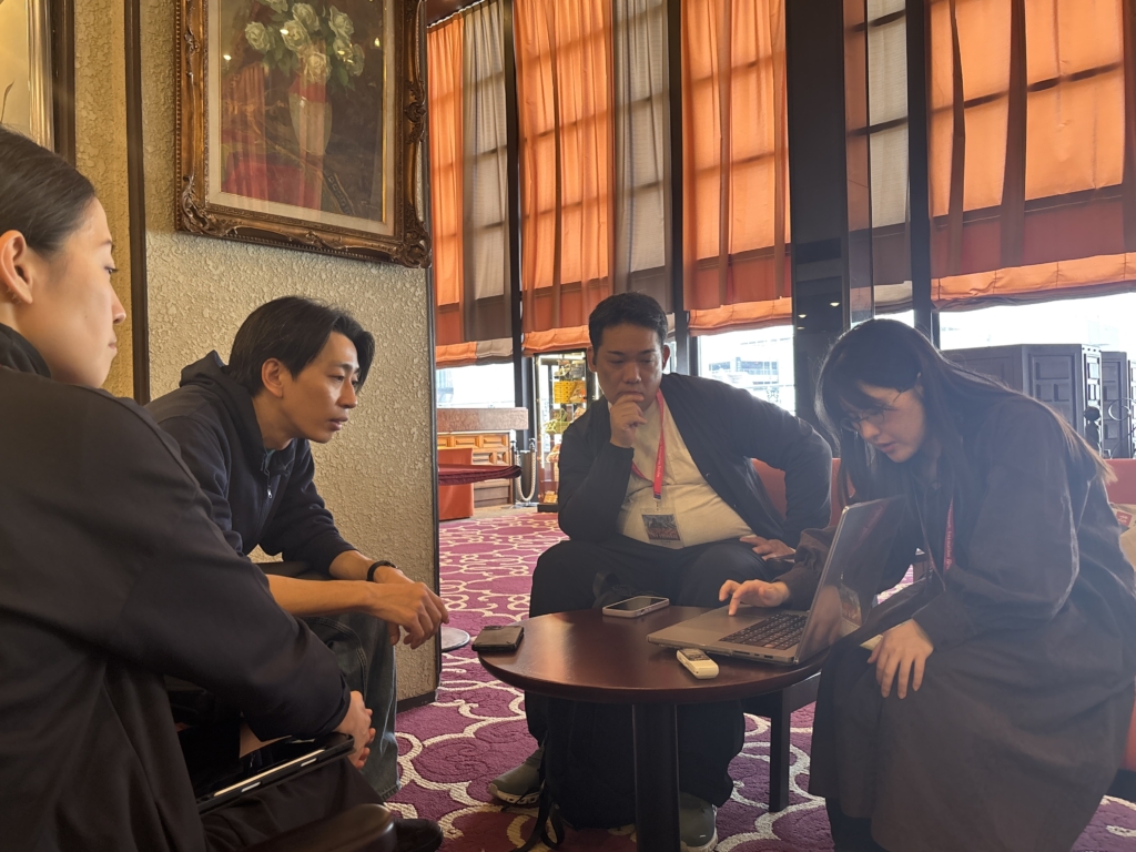 私にとってもう一つ印象的な出来事は、夜にロビーで集まって行った、その日の振り返りです。ちょうど片渕須直さんの講演会を聞き終わったあとに軽くお話ししようと、第2期採択作家の大前奨平さんと、NeW NeWコーディネーターの尾関さんと、夜21時から集まりました。